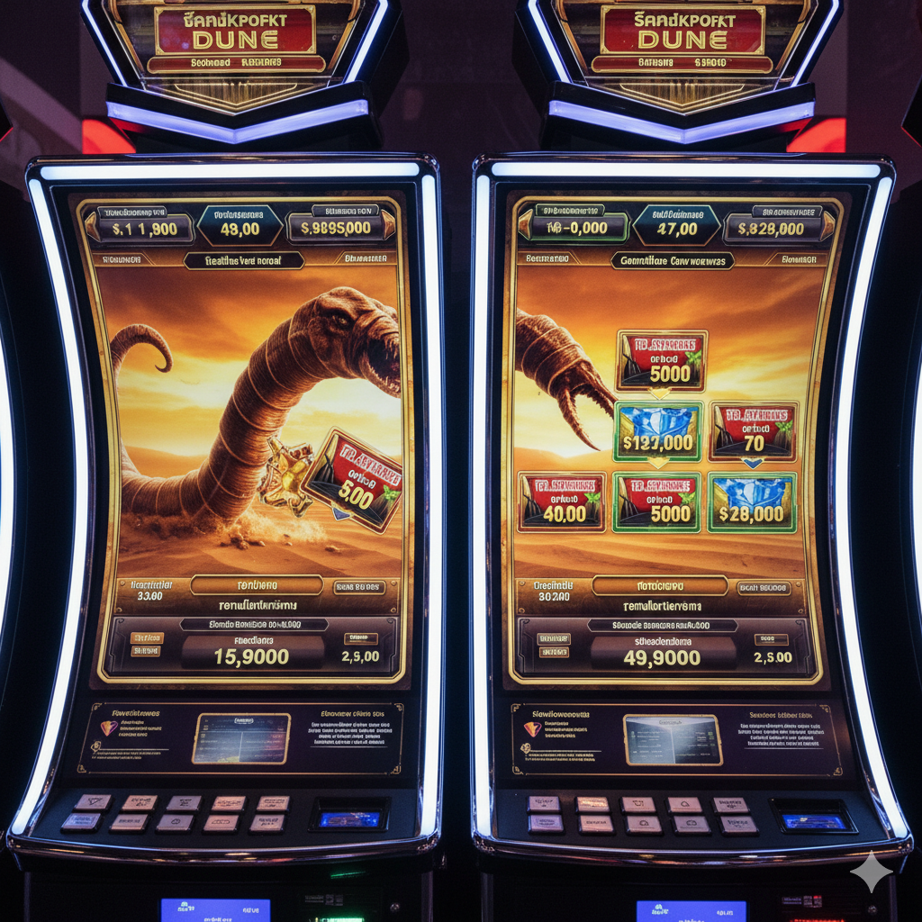 ข่าวดีสำหรับแฟนๆ: “Dune Slot Machine” มีอยู่จริง! แต่ต้องทำความเข้าใจก่อนว่า นี่คือตู้สล็อตแมชชีนแบบ “Land-Based” (ตู้เกมที่ตั้งอยู่ในคาสิโนจริง) ที่ผลิตโดยบริษัทเกมยักษ์ใหญ่อย่าง Aristocrat Gaming ซึ่งเปิดตัวครั้งแรกในปี 2021 พร้อมกับการฉายภาพยนตร์ภาคแรก